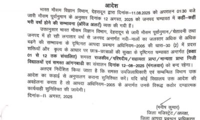 ऑरेंज अलर्ट के चलते मंगलवार 12 अगस्त को चंपावत जिले के समस्त विद्यालयों एवं आंगनबाड़ी केंद्रों में अवकाश घोषित